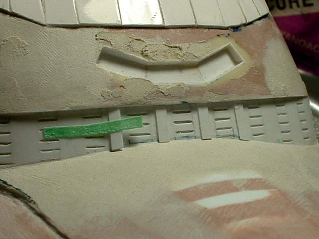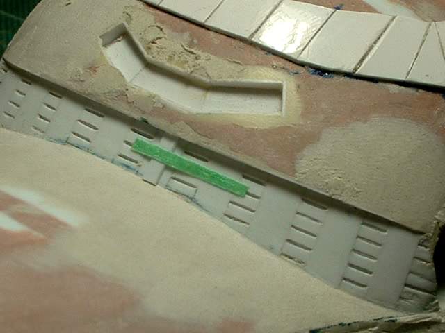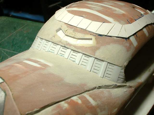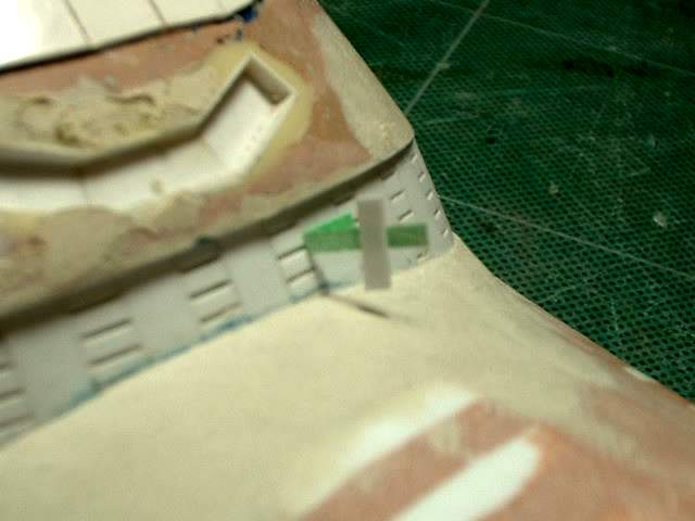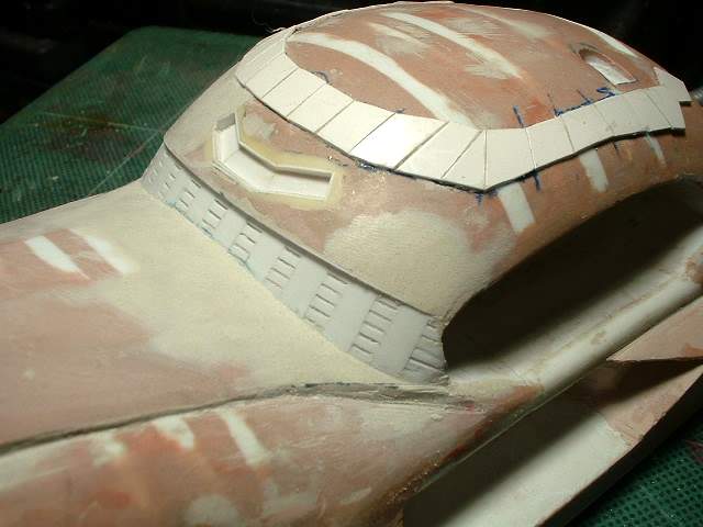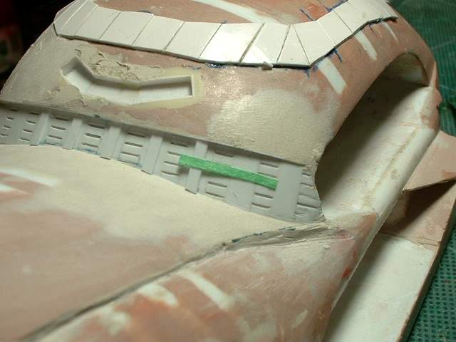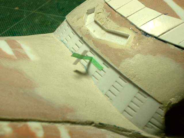 So on to the next detail items. These will be the base of the ribs that you can see in this section. It is not an easy location to glue items onto. To make it easier I am using a strip of masking tape to hold the part to be glued in position. I then peel back the part and tape. I apply glue to the back of the part and when I bring the tape down it will position the part exactly where I want it. This works better then fine tweezers as the part is too small to hold properly with tweezers. It is a slow process but it puts the part exactly where I want it. |