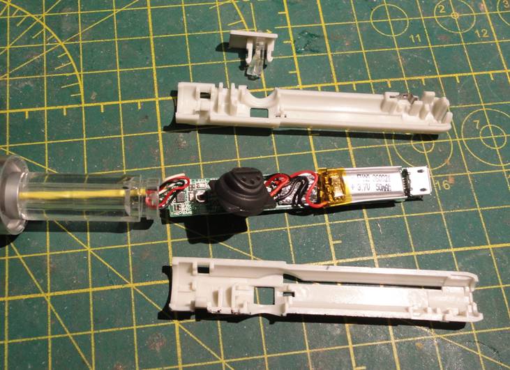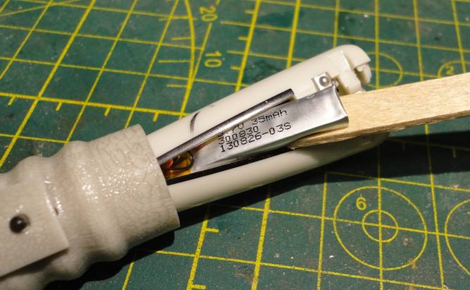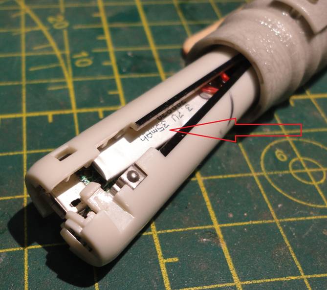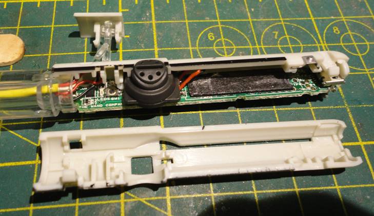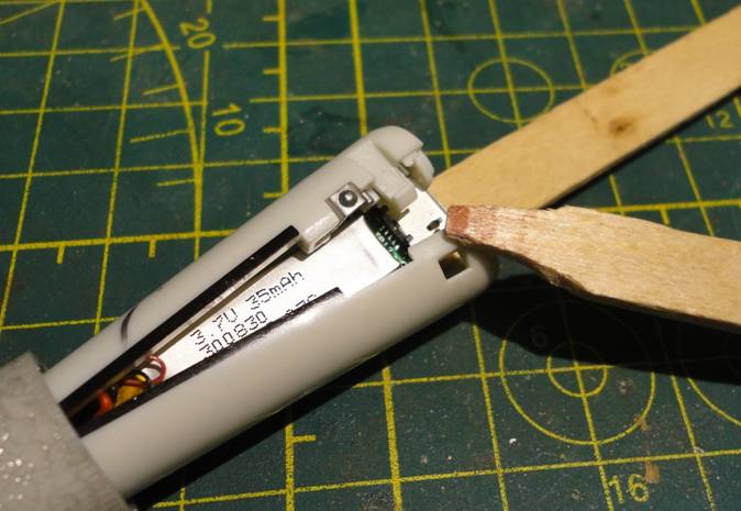 5. The two halves are forced apart and you can see the battery (3.7V 35mAh) You can also see the end of the clip that held the 2 halves together.