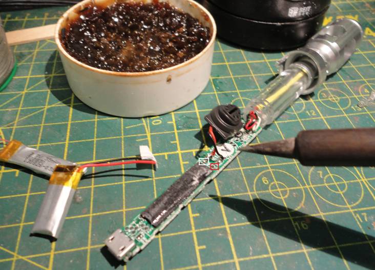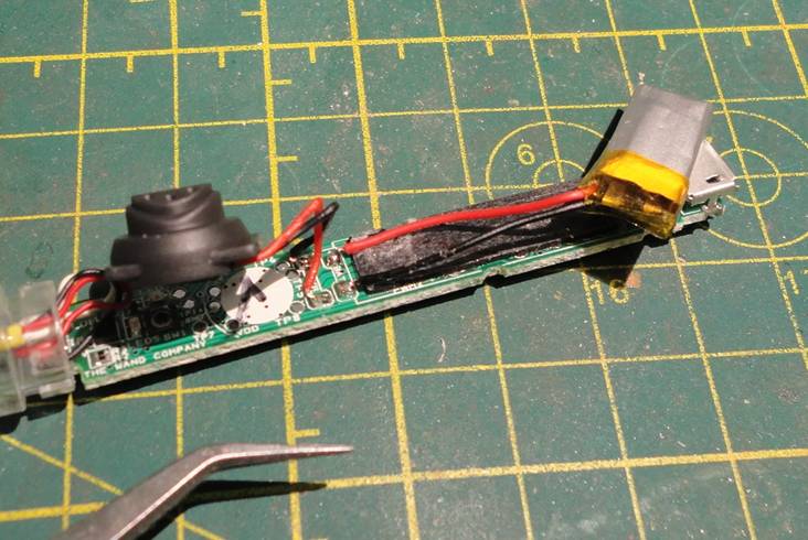 The new battery all soldered in. Test the sonic to make sure it works with the new battery after soldering.